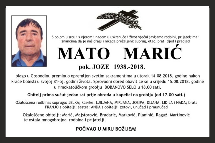 blago u Gospodinu preminuo opremljen svetim sakramentima u utorak 14.08.2018. godine nakon kraće bolesti u svojoj 81-oj. godini života. Sprovodni obred obavit će se u srijedu 15.08.2018. godine u rimokatoličkom groblju BOBANOVO SELO u 18.00 sati.