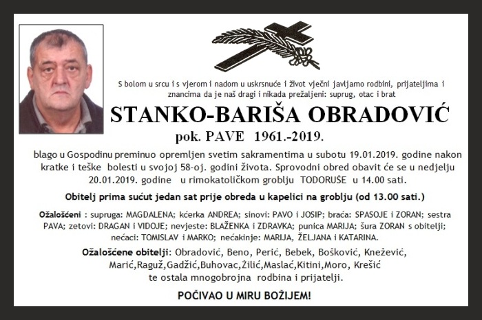 blago u Gospodinu preminuo opremljen svetim sakramentima u subotu 19.01.2019. godine nakon kratke i teške bolesti u svojoj 58-oj. godini života. Sprovodni obred obavit će se u nedjelju 20.01.2019. godine u rimokatoličkom groblju TODORUŠE u 14.00 sati.