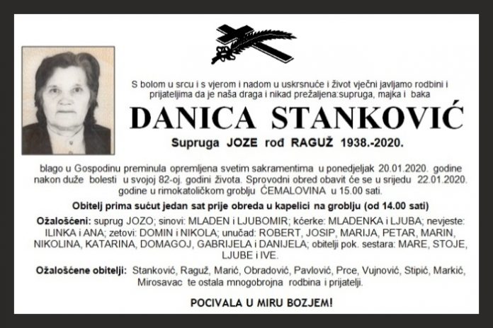 blago u Gospodinu preminula opremljena svetim sakramentima u ponedjeljak 20.01.2020. godine nakon duže bolesti u svojoj 82-oj. godini života. Sprovodni obred obavit će se u srijedu 22.01.2020. godine u rimokatoličkom groblju ĆEMALOVINA u 15.00 sati.