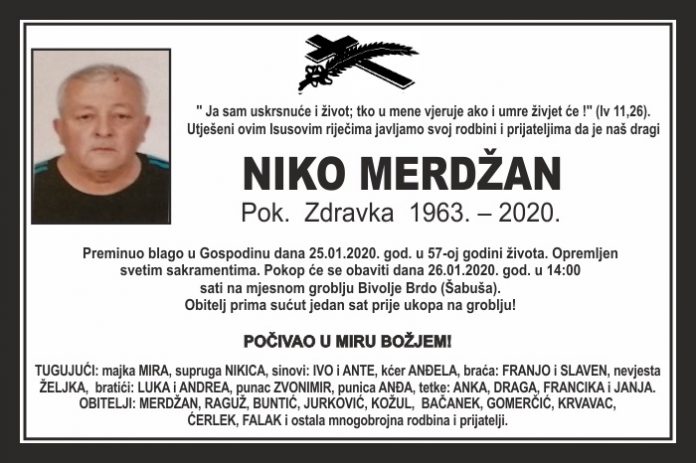Preminuo blago u Gospodinu dana 25.01.2020. god. u 57-oj godini života. Opremljen svetim sakramentima. Pokop će se obaviti dana 26.01.2020. god. u 14:00 sati na mjesnom groblju Bivolje Brdo (Šabuša).