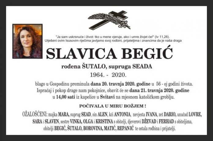 blago u Gospodinu preminula dana 20. travnja 2020. godine u 56 – oj godini života. Ispraćaj i pokop drage nam pokojnice, obavit će se dana 21. travnja 2020. godine u 14,00 sati iz kapelice u Svitavi na mjesnom katoličkom groblju.