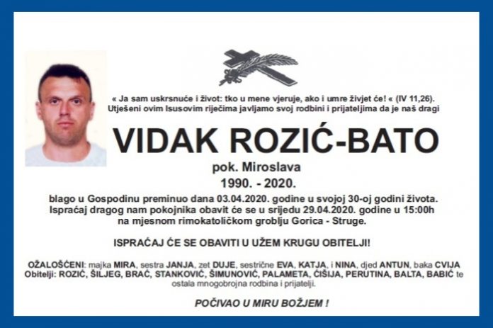 blago u Gospodinu preminuo dana 03.04.2020. godine u svojoj 30-oj godini života. Ispraćaj dragog nam pokojnika obavit će se u srijedu 29.04.2020. godine u 15:00h na mjesnom rimokatoličkom groblju Gorica – Struge.