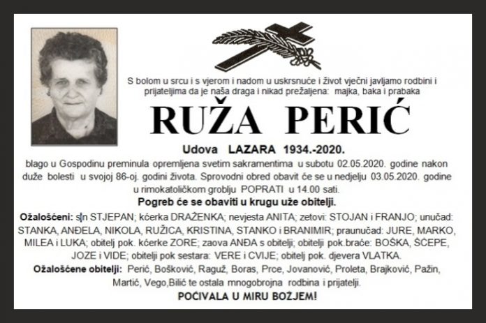 blago u Gospodinu preminula opremljena svetim sakramentima u subotu 02.05.2020. godine nakon duže bolesti u svojoj 86-oj. godini života. Sprovodni obred obavit će se u nedjelju 03.05.2020. godine u rimokatoličkom groblju POPRATI u 14.00 sati.