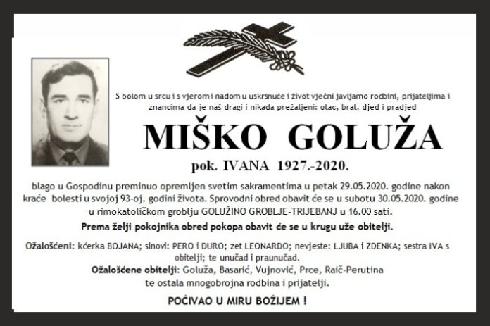 blago u Gospodinu preminuo opremljen svetim sakramentima u petak 29.05.2020. godine nakon kraće bolesti u svojoj 93-oj. godini života. Sprovodni obred obavit će se u subotu 30.05.2020. godine u rimokatoličkom groblju GOLUŽINO GROBLJE-TRIJEBANJ u 16.00 sati.