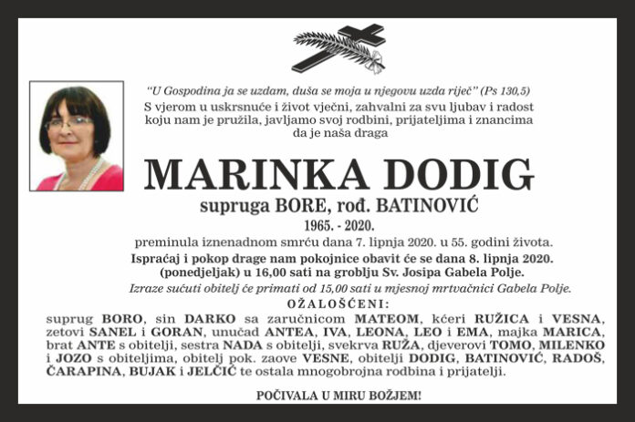 Ispraćaj i pokop drage nam pokojnice obavit će se dana 8. lipnja 2020. (ponedjeljak) u 16,00 sati na groblju Sv. Josipa Gabela Polje.