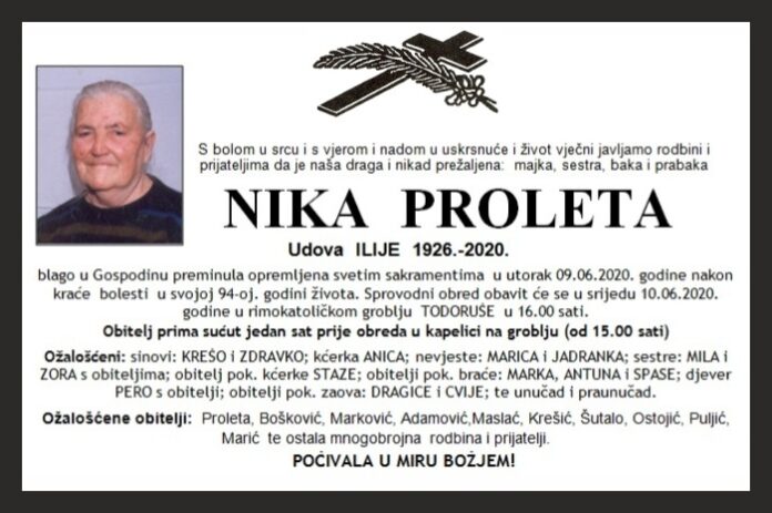 blago u Gospodinu preminula opremljena svetim sakramentima u utorak 09.06.2020. godine nakon kraće bolesti u svojoj 94-oj. godini života. Sprovodni obred obavit će se u srijedu 10.06.2020. godine u rimokatoličkom groblju TODORUŠE u 16.00 sati.