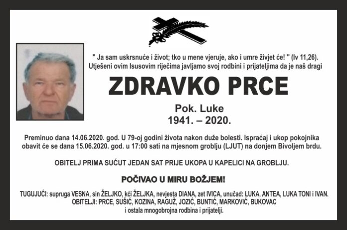 Preminuo dana 14.06.2020. god. U 79-oj godini života nakon duže bolesti. Ispraćaj i ukop pokojnika obavit će se dana 15.06.2020. god. u 17:00 sati na mjesnom groblju (LJUT) na donjem Bivoljem brdu.