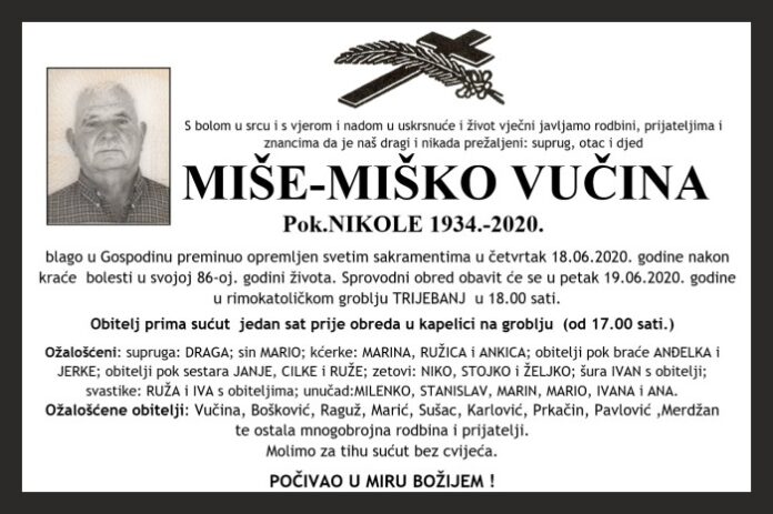 blago u Gospodinu preminuo opremljen svetim sakramentima u četvrtak 18.06.2020. godine nakon kraće bolesti u svojoj 86-oj. godini života. Sprovodni obred obavit će se u petak 19.06.2020. godine u rimokatoličkom groblju TRIJEBANJ u 18.00 sati.