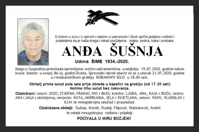 blago u Gospodinu preminula opremljena svetim sakramentima u nedjelju 19.07.2020. godine nakon kraće bolesti u svojoj 86-oj. godini života. Sprovodni obred obavit će se u utorak 21.07.2020. godine u rimokatoličkom groblju BOBANOVO SELO u 18.00 sati.