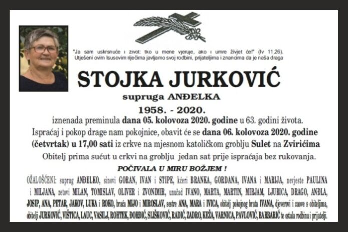 iznenada preminula dana 05. kolovoza 2020. godine u 63. godini života. Ispraćaj i pokop drage nam pokojnice, obavit će se dana 06. kolovoza 2020. godine (četvrtak) u 17,00 sati iz crkve na mjesnom katoličkom groblju Sulet na Zvirićima.