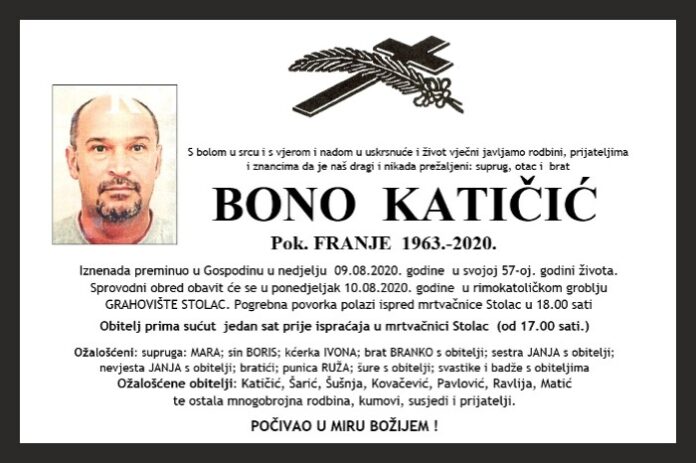 Iznenada preminuo u Gospodinu u nedjelju 09.08.2020. godine u svojoj 57-oj. godini života. Sprovodni obred obavit će se u ponedjeljak 10.08.2020. godine u rimokatoličkom groblju GRAHOVIŠTE STOLAC. Pogrebna povorka polazi ispred mrtvačnice Stolac u 18.00 sati.