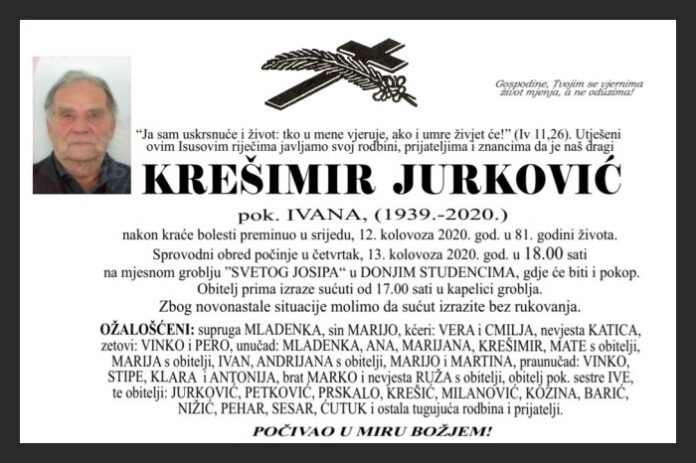 OŽALOŠĆENI: supruga MLADENKA, sin MARIJO, kćeri: VERA i CMILJA, nevjesta KATICA, zetovi: VINKO i PERO, unučad: MLADENKA, ANA, MARIJANA, KREŠIMIR, MATE s obitelji, MARIJA s obitelji, IVAN, ANDRIJANA s obitelji, MARIJO i MARTINA, praunučad: VINKO, STIPE, KLARA i ANTONIJA, brat MARKO i nevjesta RUŽA s obitelji, obitelj pok. sestre IVE, te obitelji: JURKOVIĆ, PETKOVIĆ, PRSKALO, KREŠIĆ, MILANOVIĆ, KOZINA, BARIĆ, NIŽIĆ, PEHAR, SESAR, ĆUTUK i ostala tugujuća rodbina i prijatelji.