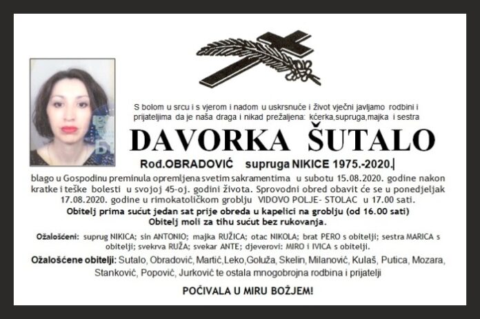 blago u Gospodinu preminula opremljena svetim sakramentima u subotu 15.08.2020. godine nakon kratke i teške bolesti u svojoj 45-oj. godini života. Sprovodni obred obavit će se u ponedjeljak 17.08.2020. godine u rimokatoličkom groblju VIDOVO POLJE- STOLAC u 17.00 sati.