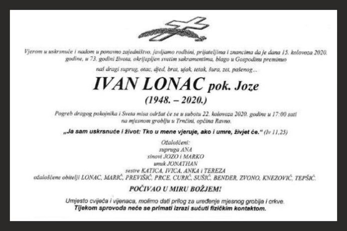Pogreb dragog pokojnika i Sveta misa održat će se u subotu 22. kolovoza 2020. godine u 17:00 sati na mjesnom groblju u Trnčini, općina Ravno.