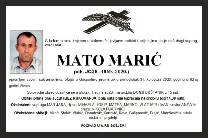 Sprovodni obred obavit će se u utorak, 1. rujna 2020., na groblju DONJI BRŠTANIK u 15 sati.