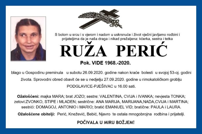 blago u Gospodinu preminula u subotu 26.09.2020. godine nakon kraće bolesti u svojoj 53-oj. godini života. Sprovodni obred obavit će se u nedjelju 27.09.2020. godine u rimokatoličkom groblju PODGLAVICE-PJEŠIVAC u 16.00 sati.