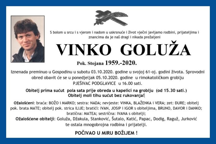 Iznenada preminuo u Gospodinu u subotu 03.10.2020. godine u svojoj 61-oj. godini života. Sprovodni obred obavit će se u ponedjeljak 05.10.2020. godine u rimokatoličkom groblju PJEŠIVAC PODGLAVICE u 16.00 sati.