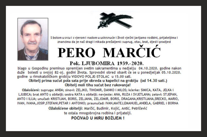 blago u Gospodinu preminuo opremljen svetim sakramentima u nedjelju 04.10.2020. godine nakon duže bolesti u svojoj 82-oj. godini života. Sprovodni obred obavit će se u ponedjeljak 05.10.2020. godine u rimokatoličkom groblju VIDOVO POLJE-STOLAC u 15.00 sati.