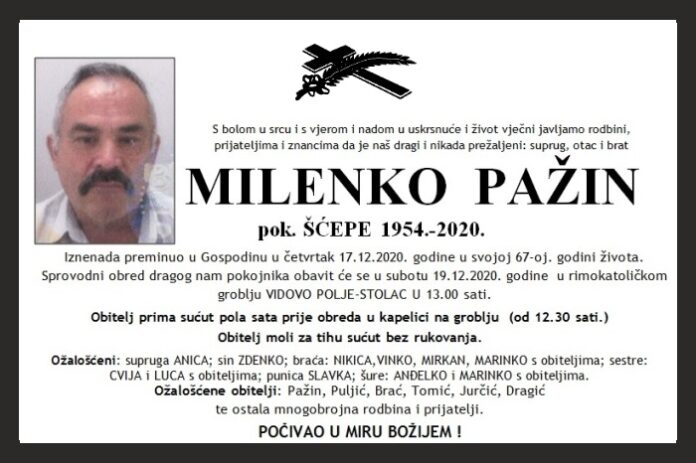 Iznenada preminuo u Gospodinu u četvrtak 17.12.2020. godine u svojoj 67-oj. godini života. Sprovodni obred dragog nam pokojnika obavit će se u subotu 19.12.2020. godine u rimokatoličkom groblju VIDOVO POLJE-STOLAC U 13.00 sati.