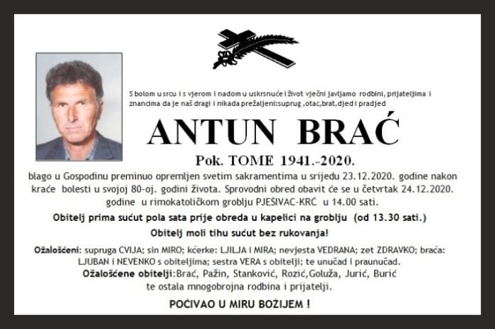 blago u Gospodinu preminuo opremljen svetim sakramentima u srijedu 23.12.2020. godine nakon kraće bolesti u svojoj 80-oj. godini života. Sprovodni obred obavit će se u četvrtak 24.12.2020. godine u rimokatoličkom groblju PJEŠIVAC-KRČ u 14.00 sati.