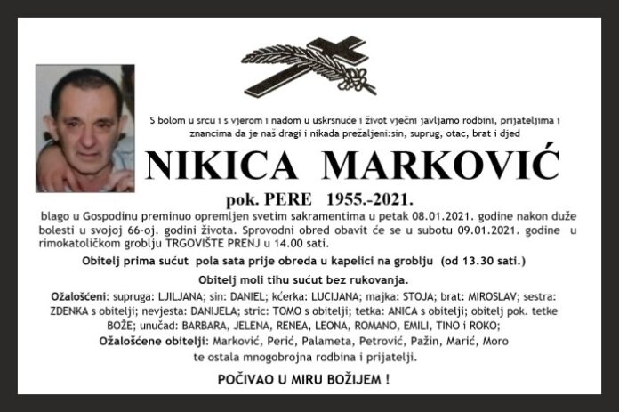 blago u Gospodinu preminuo opremljen svetim sakramentima u petak 08.01.2021. godine nakon duže bolesti u svojoj 66-oj. godini života. Sprovodni obred obavit će se u subotu 09.01.2021. godine u rimokatoličkom groblju TRGOVIŠTE PRENJ u 14.00 sati.