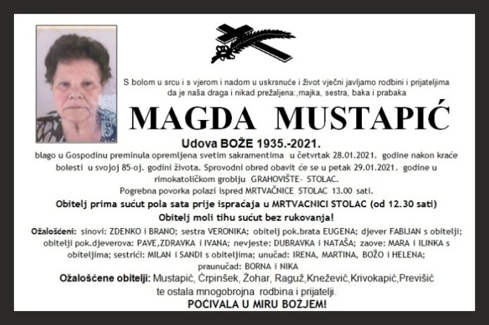 blago u Gospodinu preminula opremljena svetim sakramentima u četvrtak 28.01.2021. godine nakon kraće bolesti u svojoj 85-oj. godini života. Sprovodni obred obavit će se u petak 29.01.2021. godine u rimokatoličkom groblju GRAHOVIŠTE- STOLAC.