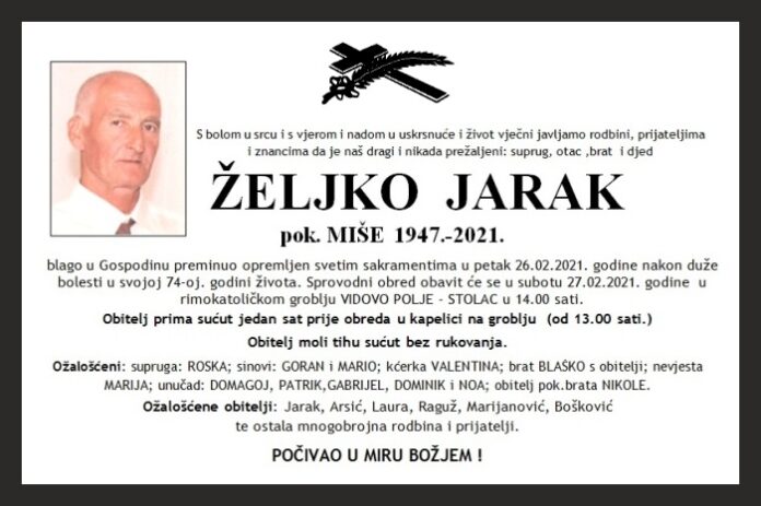 blago u Gospodinu preminuo opremljen svetim sakramentima u petak 26.02.2021. godine nakon duže bolesti u svojoj 74-oj. godini života. Sprovodni obred obavit će se u subotu 27.02.2021. godine u rimokatoličkom groblju VIDOVO POLJE – STOLAC u 14.00 sati.