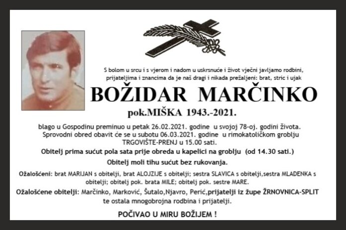 blago u Gospodinu preminuo u petak 26.02.2021. godine u svojoj 78-oj. godini života. Sprovodni obred obavit će se u subotu 06.03.2021. godine u rimokatoličkom groblju TRGOVIŠTE-PRENJ u 15.00 sati.