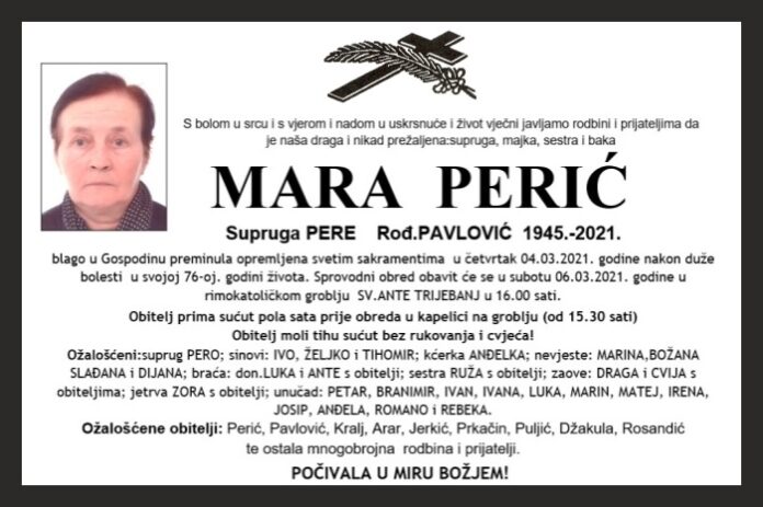 blago u Gospodinu preminula opremljena svetim sakramentima u četvrtak 04.03.2021. godine nakon duže bolesti u svojoj 76-oj. godini života. Sprovodni obred obavit će se u subotu 06.03.2021. godine u rimokatoličkom groblju SV.ANTE TRIJEBANJ u 16.00 sati.