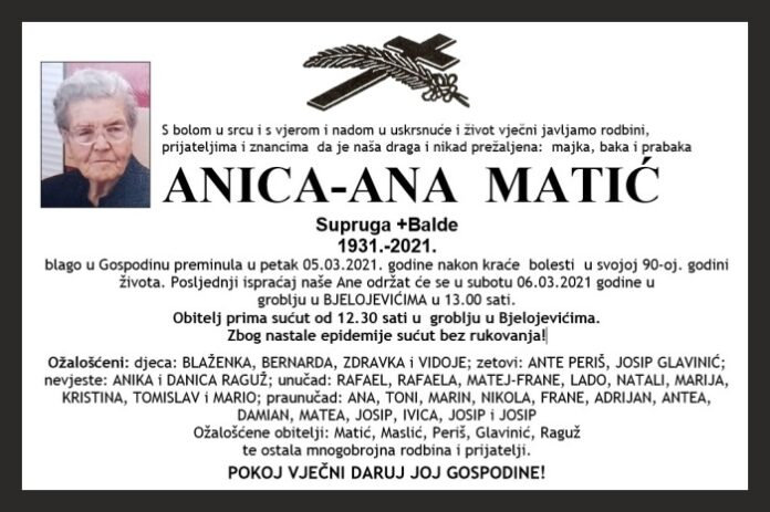 blago u Gospodinu preminula u petak 05.03.2021. godine nakon kraće bolesti u svojoj 90-oj. godini života. Posljednji ispraćaj naše Ane održat će se u subotu 06.03.2021 godine u groblju u BJELOJEVIĆIMA u 13.00 sati.