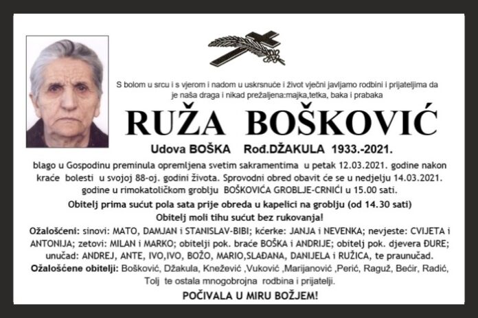 blago u Gospodinu preminula opremljena svetim sakramentima u petak 12.03.2021. godine nakon kraće bolesti u svojoj 88-oj. godini života. Sprovodni obred obavit će se u nedjelju 14.03.2021. godine u rimokatoličkom groblju BOŠKOVIĆA GROBLJE-CRNIĆI u 15.00 sati.