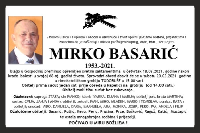 blago u Gospodinu preminuo opremljen svetim sakramentima u četvrtak 18.03.2021. godine nakon kraće bolesti u svojoj 68-oj. godini života. Sprovodni obred obavit će se u subotu 20.03.2021. godine u rimokatoličkom groblju TODORUŠE u 15.00 sati.