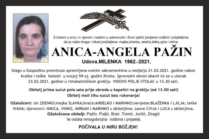 blago u Gospodinu preminula opremljena svetim sakramentima u nedjelju 21.03.2021. godine nakon kratke i teške bolesti u svojoj 59-oj. godini života. Sprovodni obred obavit će se u utorak 23.03.2021. godine u rimokatoličkom groblju VIDOVO POLJE-STOLAC u 13.30 sati.