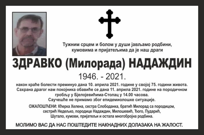 ОЖАЛОШЋЕНИ: Кћерка Хелена, сестра Слободанка, братић Милорад са породицом, сестрић Недељко, породице Надаждин, Милошевић, Ђого, Пударић, Шутало, кумови, пријатељи и остала многобројна родбина.