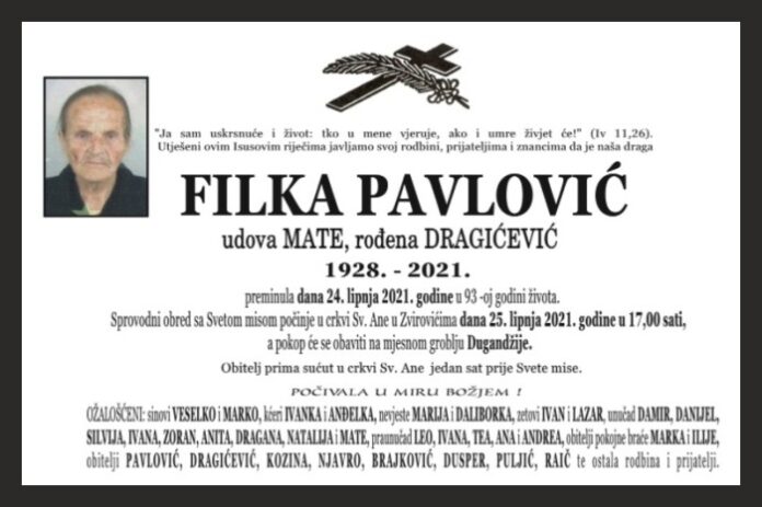 OŽALOŠĆENI: sinovi VESELKO i MARKO, kćeri IVANKA i ANĐELKA, nevjeste MARIJA i DALIBORKA, zetovi IVAN i LAZAR, unučad DAMIR, DANIJEL, SILVIJA, IVANA, ZORAN, ANITA, DRAGANA, NATALIJA i MATE, praunučad LEO, IVANA, TEA, ANA i ANDREA, obitelji pokojne braće MARKA i ILIJE, obitelji PAVLOVIĆ, DRAGIĆEVIĆ, KOZINA, NJAVRO, BRAJKOVIĆ, DUSPER, PULJIĆ, RAIČ te ostala rodbina i prijatelji.