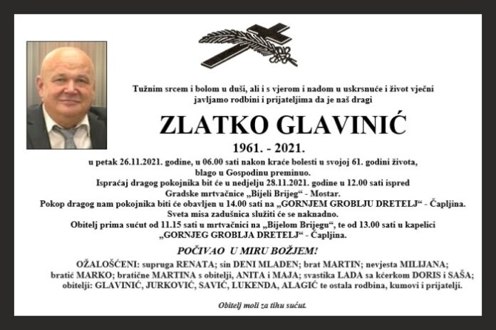 Ispraćaj dragog pokojnika bit će u nedjelju 28.11.2021. godine u 12.00 sati ispred Gradske mrtvačnice „Bijeli Brijeg“ – Mostar.