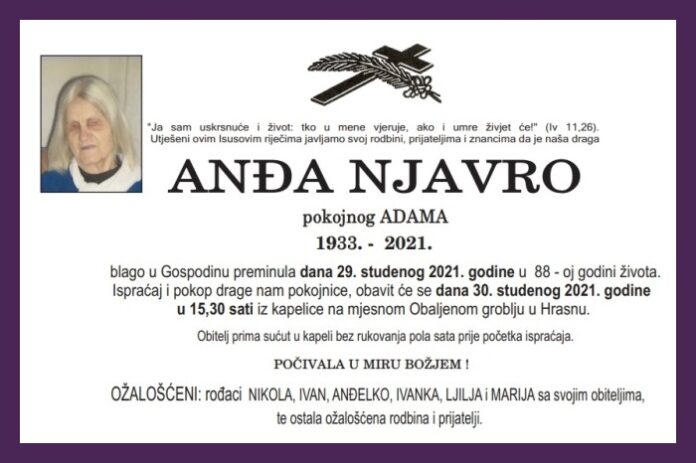 blago u Gospodinu preminula dana 29. studenog 2021. godine u 88 – oj godini života. Ispraćaj i pokop drage nam pokojnice, obavit će se dana 30. studenog 2021. godine u 15,30 sati iz kapelice na mjesnom Obaljenom groblju u Hrasnu.