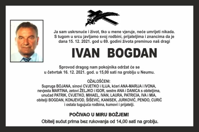 OŽALOŠĆENI: Supruga BOJANA, sinovi CVJETKO i ILIJA, kćeri ANA-MARIJA i IVONA, nevjesta MARTINA, zetovi ŽELJKO i IGOR, sestre ANA i DANICA s obiteljima, unučad PATRIK, CVJETKO, MIHAEL, IVAN, LAURA, PATRICIA, IVA i MIA, obitelji BOGDAN, KONJEVOD, ŠIŠEVIĆ, KANISEK, JURKOVIĆ, PENDO, CURIĆ i ostala tugujuća rodbina, kumovi i prijatelji.