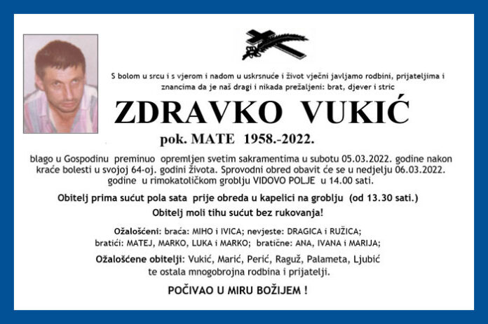 blago u Gospodinu preminuo opremljen svetim sakramentima u subotu 05.03.2022. godine nakon kraće bolesti u svojoj 64-oj. godini života. Sprovodni obred obavit će se u nedjelju 06.03.2022. godine u rimokatoličkom groblju VIDOVO POLJE u 14.00 sati.