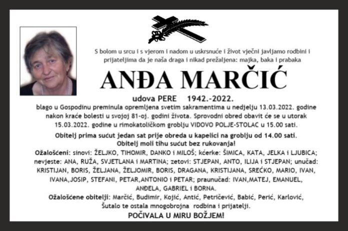 blago u Gospodinu preminula opremljena svetim sakramentima u nedjelju 13.03.2022. godine nakon kraće bolesti u svojoj 81-oj. godini života. Sprovodni obred obavit će se u utorak 15.03.2022. godine u rimokatoličkom groblju VIDOVO POLJE-STOLAC u 15.00 sati.