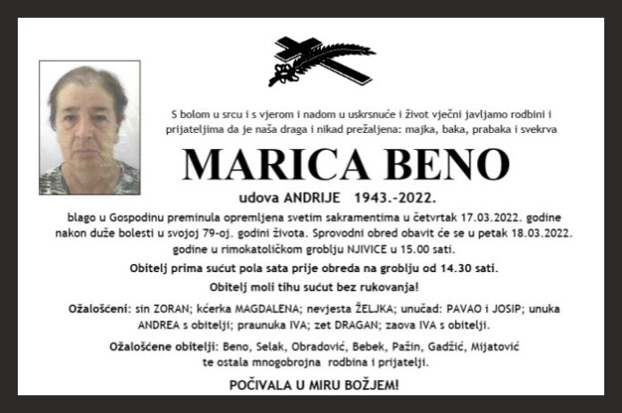 blago u Gospodinu preminula opremljena svetim sakramentima u četvrtak 17.03.2022. godine nakon duže bolesti u svojoj 79-oj. godini života. Sprovodni obred obavit će se u petak 18.03.2022. godine u rimokatoličkom groblju NJIVICE u 15.00 sati.