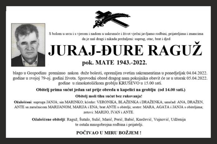 blago u Gospodinu preminuo nakon duže bolesti, opremljen svetim sakramentima u ponedjeljak 04.04.2022. godine u svojoj 79-oj. godini života. Sprovodni obred dragog nam pokojnika obavit će se u utorak 05.04.2022. godine u rimokatoličkom groblju KRUŠEVO u 15.00 sati.