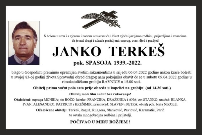 blago u Gospodinu preminuo opremljen svetim sakramentima u srijedu 06.04.2022 godine nakon kraće bolesti u svojoj 83-oj godini života. Sprovodni obred dragog nam pokojnika obavit će se u subotu 09.04.2022 godine u rimokatoličkom groblju RAVNICE u 15.00 sati.