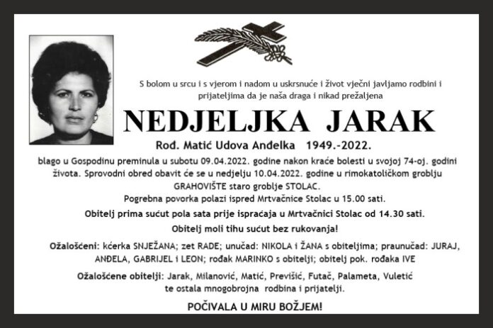 Ožalošćeni: kćerka SNJEŽANA; zet RADE; unučad: NIKOLA i ŽANA s obiteljima; praunučad: JURAJ, ANĐELA, GABRIJEL i LEON; rođak MARINKO s obitelji; obitelj pok. rođaka IVE. Ožalošćene obitelji: Jarak, Milanović, Matić, Previšić, Futač, Palameta, Vuletić te ostala mnogobrojna rodbina i prijatelji.