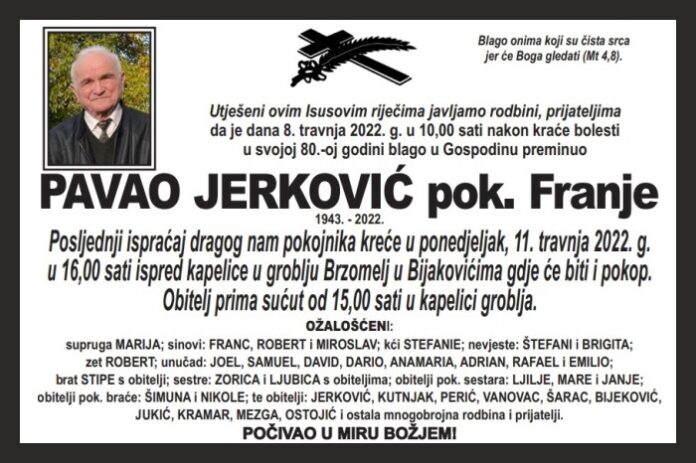 Utješeni ovim Isusovim riječima javljamo rodbini, prijateljima da je dana 8. travnja 2022. g. u 10,00 sati nakon kraće bolesti u svojoj 80.-oj godini blago u Gospodinu preminuo