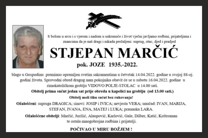 blago u Gospodinu preminuo opremljen svetim sakramentima u četvrtak 14.04.2022. godine u svojoj 88-oj. godini života. Sprovodni obred dragog nam pokojnika obavit će se u subotu 16.04.2022. godine u rimokatoličkom groblju VIDOVO POLJE-STOLAC u 14.00 sati.