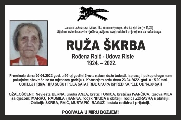 Preminula dana 20.04.2022 god. u 99-oj godini života nakon duže bolesti. Ispraćaj i pokop drage nam pokojnice obavit će se na mjesnom groblju u Komanjem brdu dana 23.04.2022. god. u 15.00 sati.