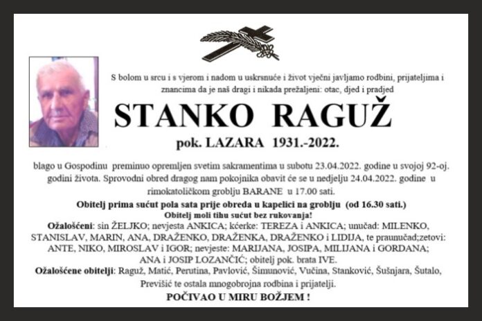 blago u Gospodinu preminuo opremljen svetim sakramentima u subotu 23.04.2022. godine u svojoj 92-oj. godini života. Sprovodni obred dragog nam pokojnika obavit će se u nedjelju 24.04.2022. godine u rimokatoličkom groblju BARANE u 17.00 sati.