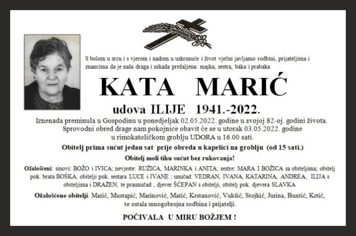 Iznenada preminula u Gospodinu u ponedjeljak 02.05.2022. godine u svojoj 82-oj. godini života. Sprovodni obred drage nam pokojnice obavit će se u utorak 03.05.2022. godine u rimokatoličkom groblju UDORA u 16.00 sati.