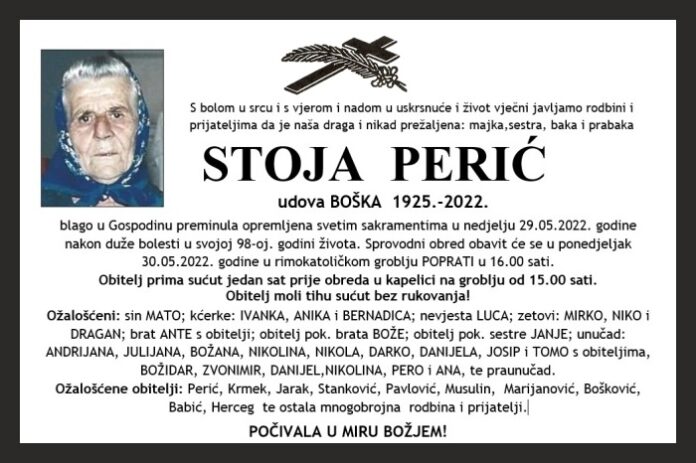 blago u Gospodinu preminula opremljena svetim sakramentima u nedjelju 29.05.2022. godine nakon duže bolesti u svojoj 98-oj. godini života. Sprovodni obred obavit će se u ponedjeljak 30.05.2022. godine u rimokatoličkom groblju POPRATI u 16.00 sati.
